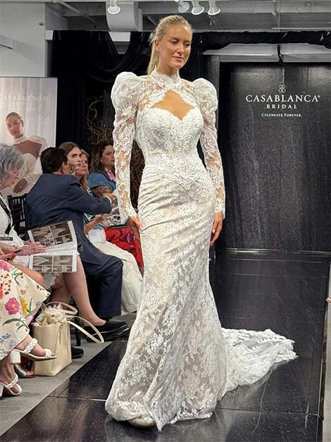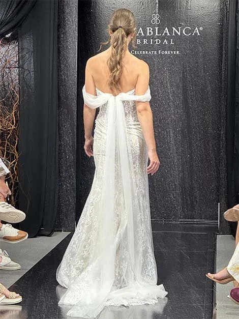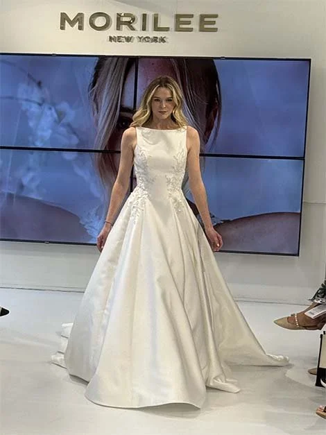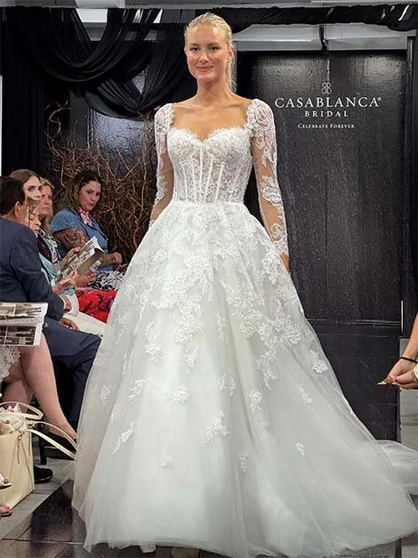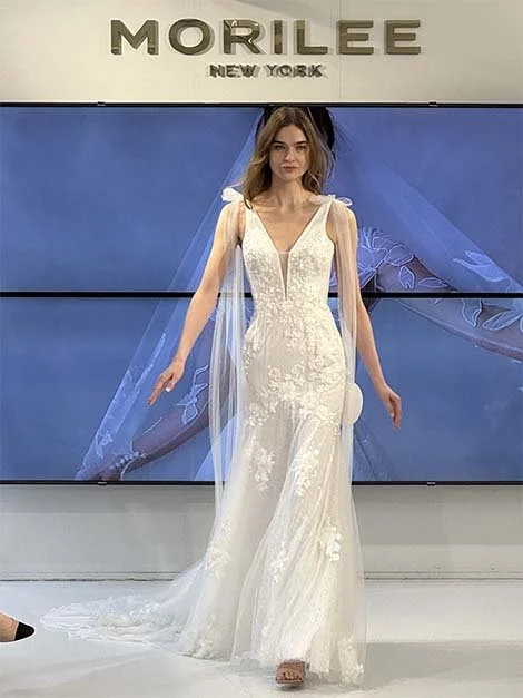 We just returned from our biannual buying trip to Chicago Bridal Market, and our cheeks hurt from smiling sooo much! Don’t get us wrong, we still very much love our minimalist dresses (and brides), but who doesn’t love a fairy tale? And that’s exactly what we were walking through at market day after day. And it wasn’t just a princess or two here or there; it was runway after runway full of princess brides from just about every genre you can dream up. There were warrior princesses with armor-like corsets, fairy princesses dressed in flowers, and even homages to real-life princesses of today, like Kate. These new gowns will be arriving in-store beginning in January, but we won’t keep you in suspense until then. Here are the specific trends we saw on the runway and what you can expect to see more of for 2026.